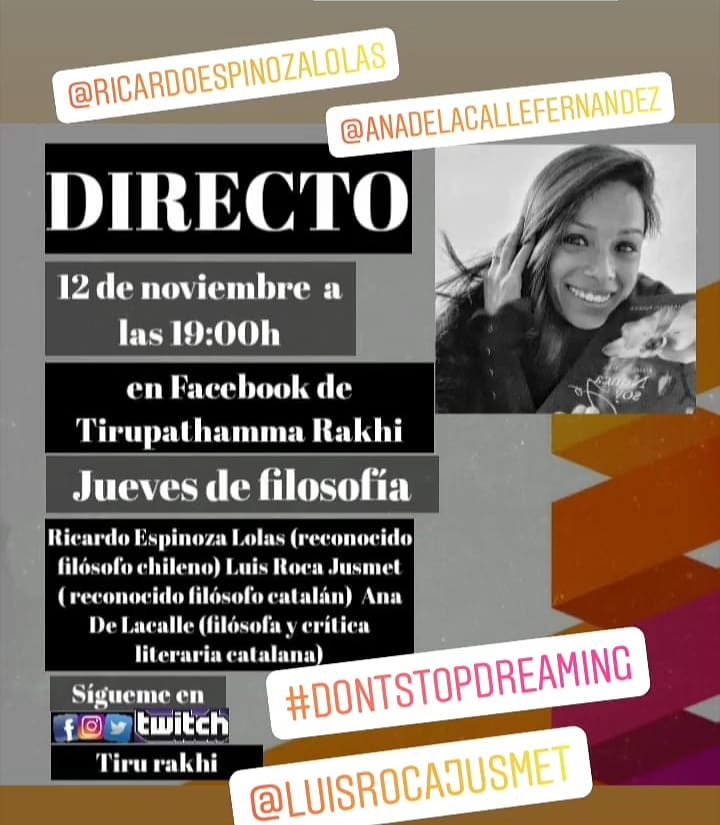 Me fascina anunciaros la emisión en directo de esta charla, diálogo o tertulia filosófica que de la mano de TIRUPATHAMMA RAKHI tendrá lugar este jueves 12 de noviembre a las 19h española, con la presencia de RICARDO ESPINOZA, LUIS ROCA JUSMET y una servidora. Huelgan las presentaciones de mis compañeros, aunque en el cartel tenéis sus referencias. Será un lujo contar con vuestra presencia.