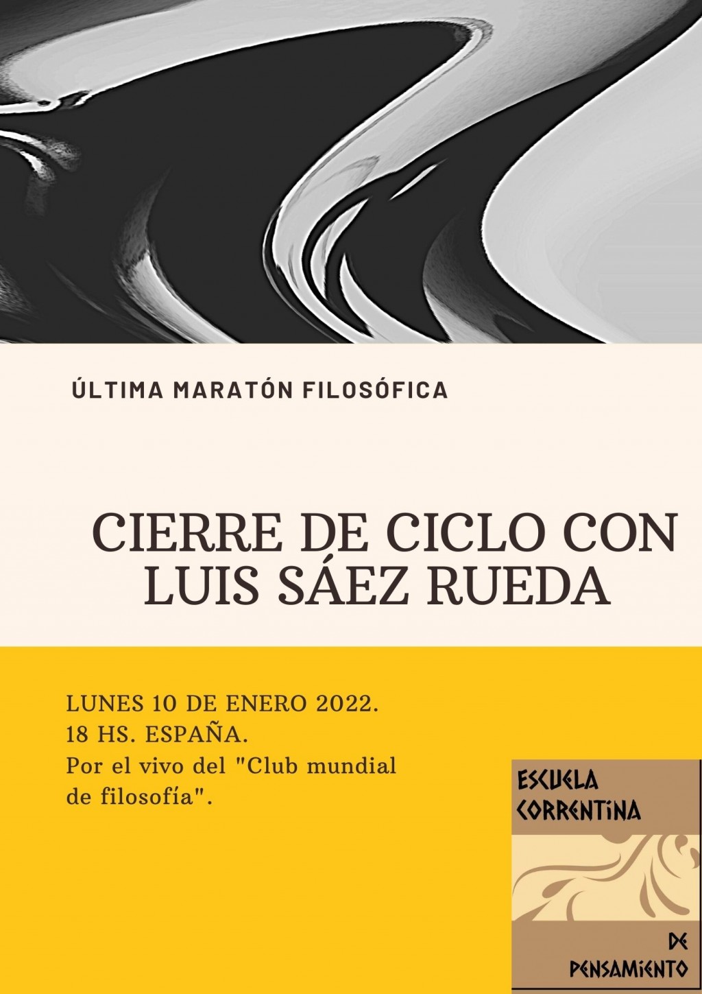 El próximo lunes 10 de enero, a las 18 hora de España (14 hora Argentina) la escuela correntina de pensamiento, antes de abrir sus puertas para sus nuevas propuesta, cerrará la del exitoso ciclo dado en llamar “maratones filosóficas” en su treinta y cinco edición con la participación de Luis Sáez Rueda.