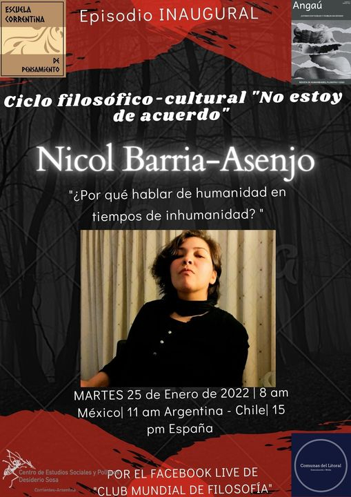 Con Nicol Barria-Asenjo hemos inaugurado este nuevo formato de diálogo y reflexión filosófica en el que tras la exposición del invitad@, en este caso a partir de la cuestión ¿Por qué hablar de humanidad en tiempos de inhumanidad?, se dispara un intercambio de perspectivas que tienden a profundizar, desarmar planteamiento y mostrar en definitiva que aquello que puede no tener una respuesta unívoca, no por ello deja de ser fundamental reconceptualizarlo mediante nuevos términos que desde el uso de ese lenguaje abran comprensiones más fructíferas sobre nosotros y el mundo. Así lo hizo la invitada Nicol Barria-Asenjo, que con su exposición fue capaz de dar pie a un diálogo abierto que os dejo en el vídeo del directo grabado. Gracias a la primera y valiente invitada en un nuevo reto de re-pensar lo que nunca se deja pensar del todo.