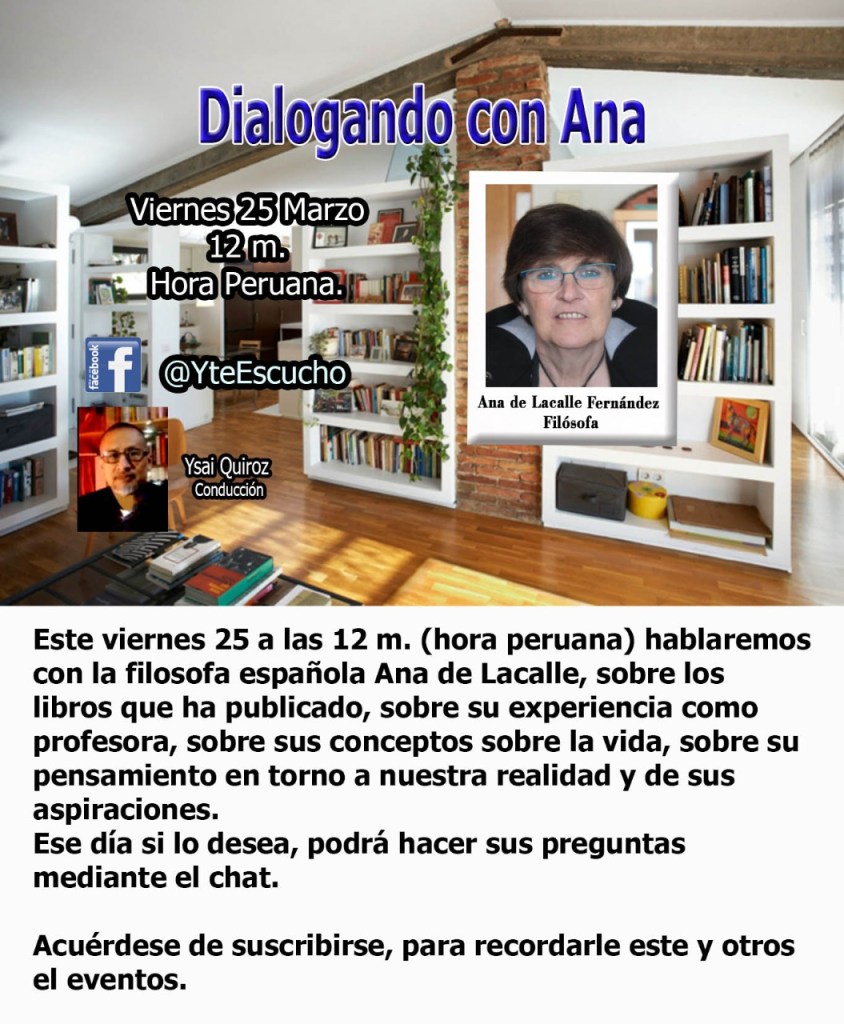 Este viernes 25 de marzo a las 18h tengo el placer de dialogar con una plataforma de difusión de la cultura y la Filosofía de la mano de la mano de ISAY QUIROZ. La retransmisión en directo a través del canal de YouTube https://www.youtube.com/watch?v=84afLIw2jxY
