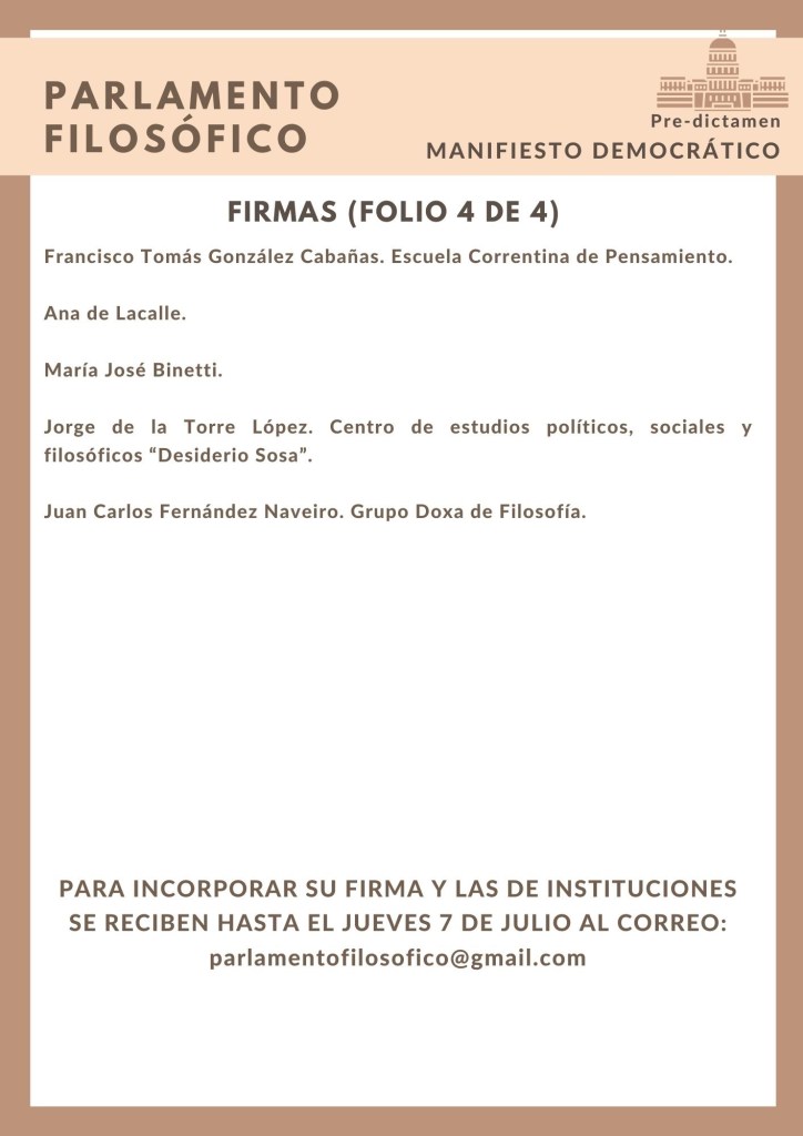 PARA INCORPORAR SU FIRMA Y LAS DE INSTITUCIONES SE RECIBEN HASTA EL VIERNES 21 DE JULIO AL CORREO: parlamentofilosofico@gmail.com