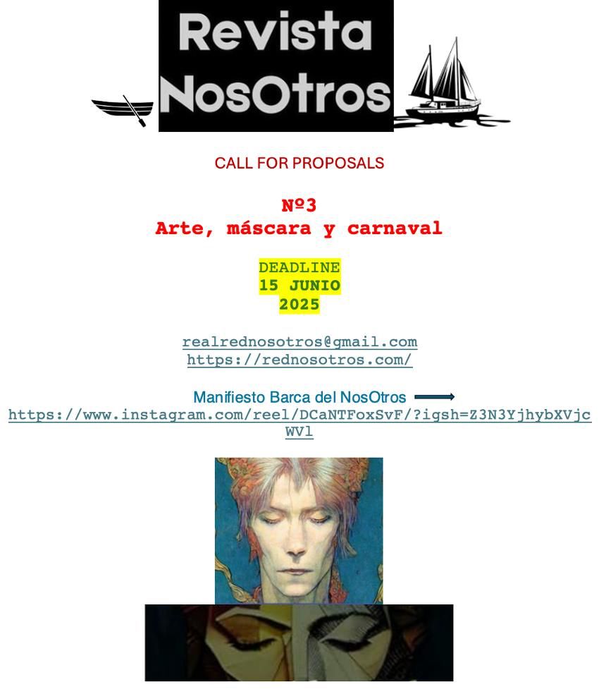 El tercer número de la revista vinculada a la red internacional NosOtros pretende ofrecer una aproximación a problemáticas tan amplias como la estética, la teoría del arte y la crítica de la industria cultural desde una figura muy determinada, la figura del carnaval, y pretende hacerlo con apoyo en una diversidad de registros expresivos que, sin renunciar a sus diferencias, tienen en común la más contundente e inequívoca toma de distancia frente a las inercias típicamente anquilosantes de la escritura académica, sobre las cuales no parece serio tratar de emitir un juicio crítico. En conformidad con ello, no se aceptarán papers o artículos escolásticos al uso, sino (de acuerdo con el proyecto de amplio alcance en el que esta publicación se enmarca) tan solo obras y creaciones estructuradas como barcas, barcas del NosOtros, trazos materiales, contingentes, porosos, contradictorios, mestizos, torcidos, inestables, inconsistentes, fallidos, incompletos, velas que recorren de punta a punta una terma vacía, pecios que navegan sobre su propia alteridad de muerte y resplandor, cuerpos que negando afirman, estofas que en la superficie del vacío encuentran un vacío aún más profundo, aún más liviano, aún más alegre: pura jovialidad de superficie. Según consta en nuestro manifiesto,