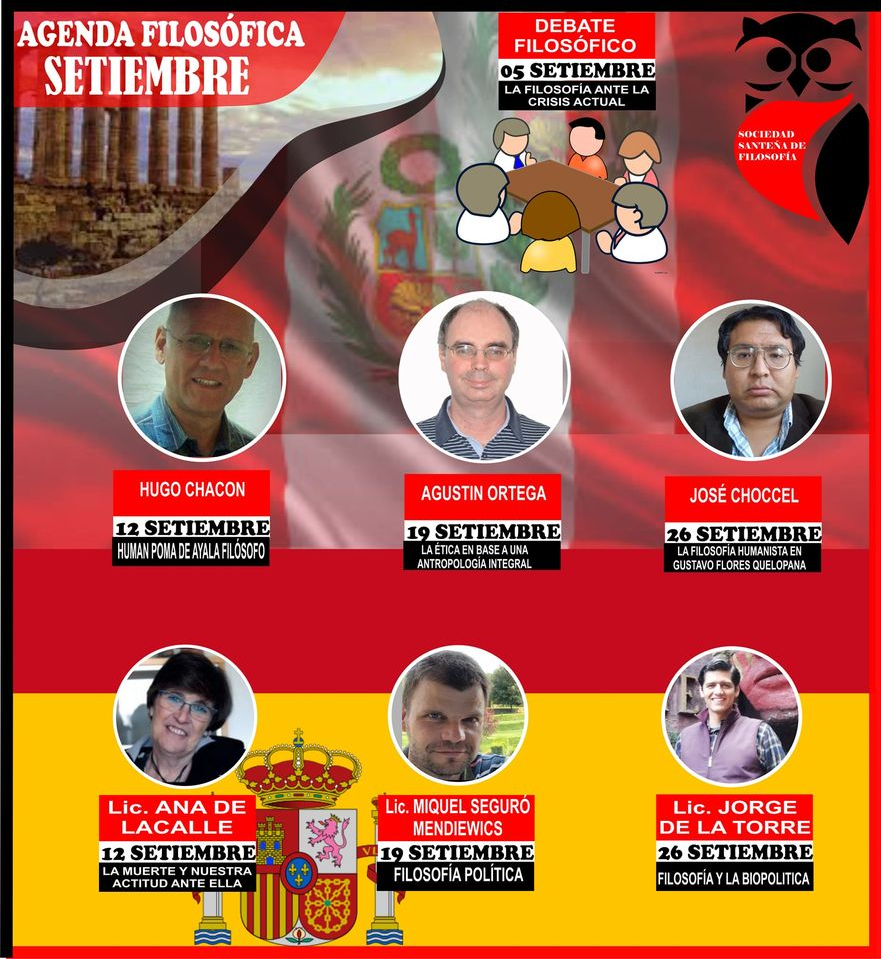 Este sábado 12 de septiembre a las 17h española, conferencia LA MUERTE:LA ÚNICA CERTEZA. por Ana de Lacalle. SOCIEDAD FILOSÓFICA SANTEÑA – PERÚ – A traves del facebook de la página.Sociedad Santeña De Filosofía5 d · AGENDA FILOSÓFICA DE SETIEMBRE!! Presentamos con ustedes nuestra agenda del mes de septiembre con la importante participación de ponentes muy