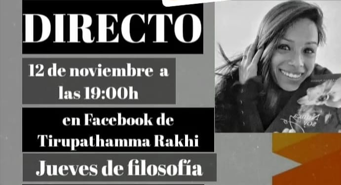Me fascina anunciaros la emisión en directo de esta charla, diálogo o tertulia filosófica que de la mano de TIRUPATHAMMA RAKHI tendrá lugar este jueves 12 de noviembre a las 19h española, con la presencia de RICARDO ESPINOZA, LUIS ROCA JUSMET y una servidora. Huelgan las presentaciones de mis compañeros, aunque en el cartel tenéis